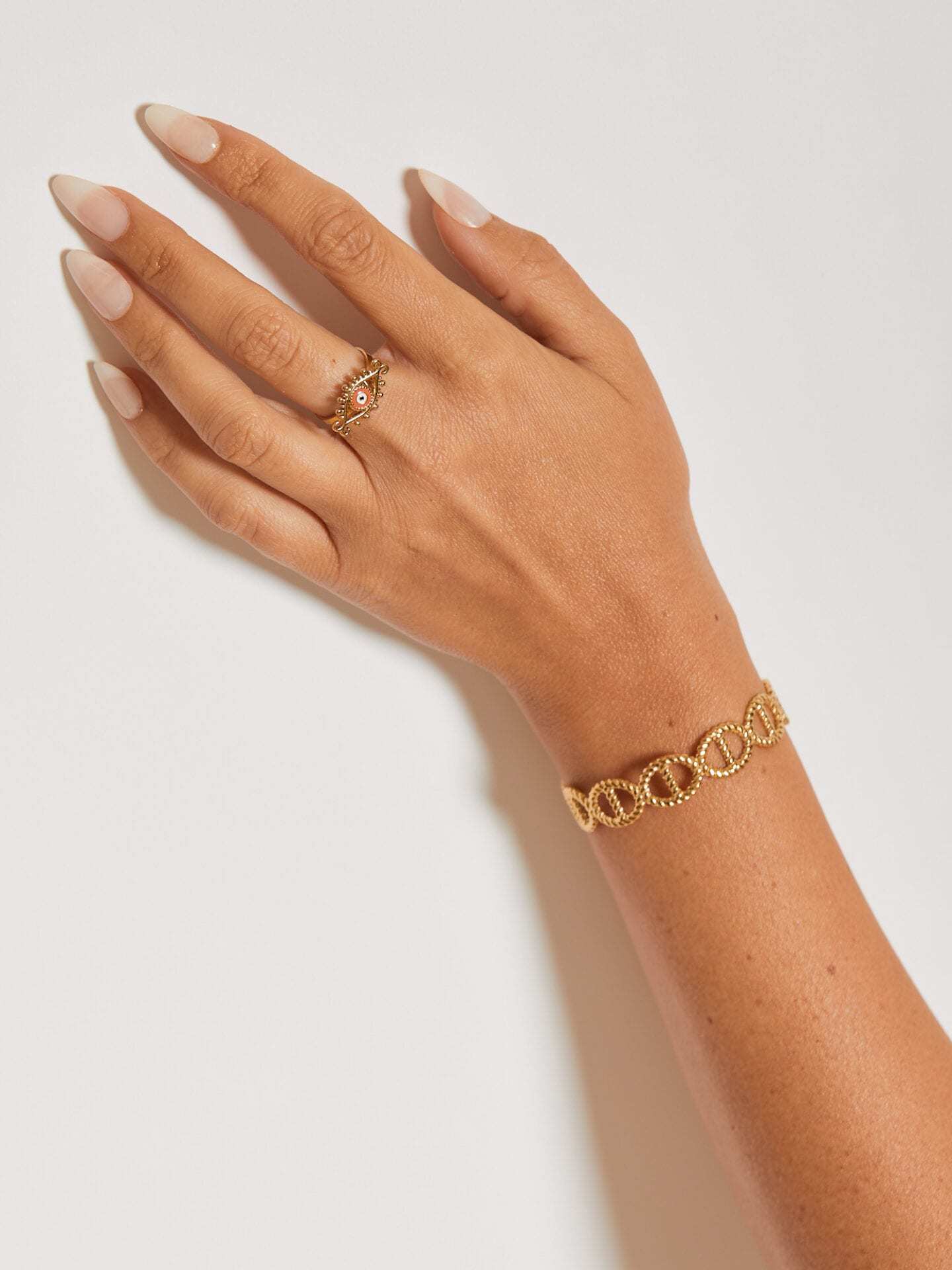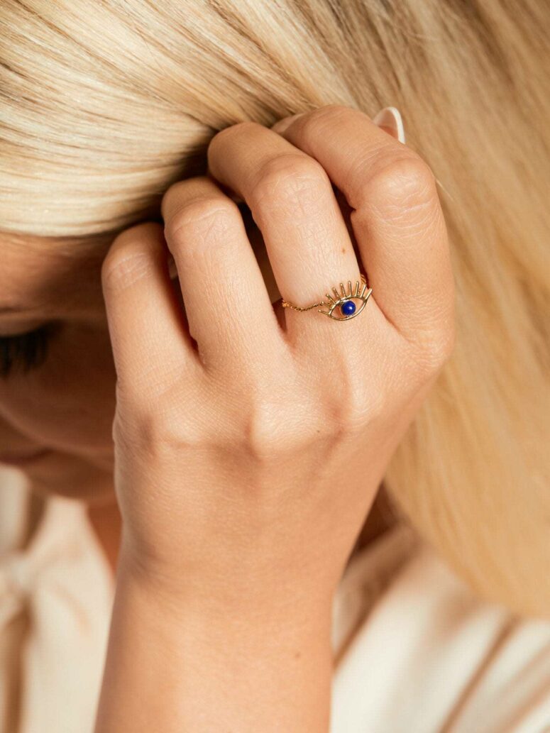 Dieser Ring mit orientalischem Flair fällt durch sein außergewöhnliches Augendesign auf. Die verschnörkelten Goldelemente bilden eine tolle Harmonie zu den hellroten und weißen Elementen des Schmuckstücks.