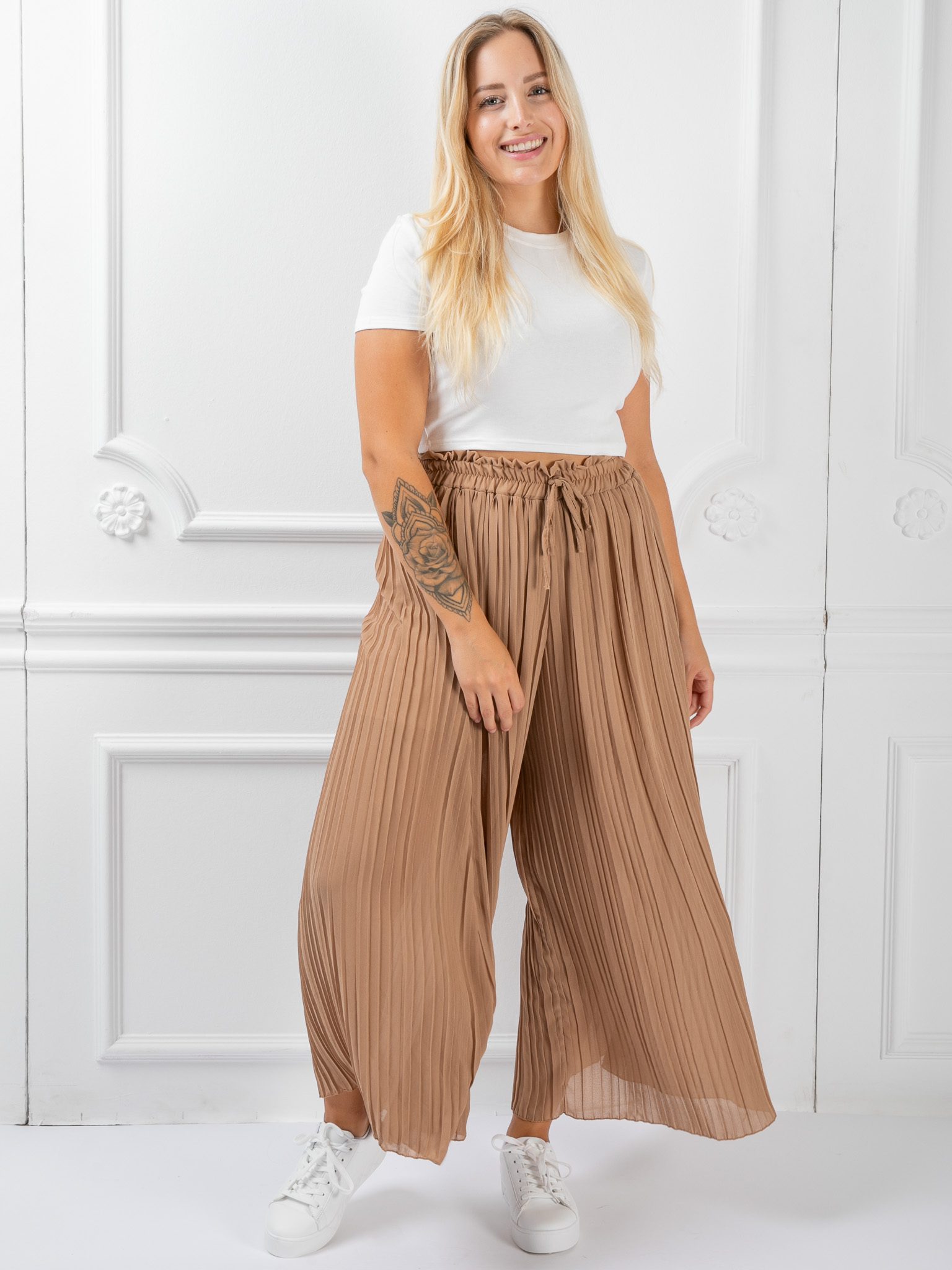 Feine Falten betonen das weite Bein zusammen mit einem hohen, flexiblen Bund, ein Design das den Silhouetten von Frauen schmeichelt. Die plissierten Hosen bestehen häufig aus Leinen, Seide oder Lamé.